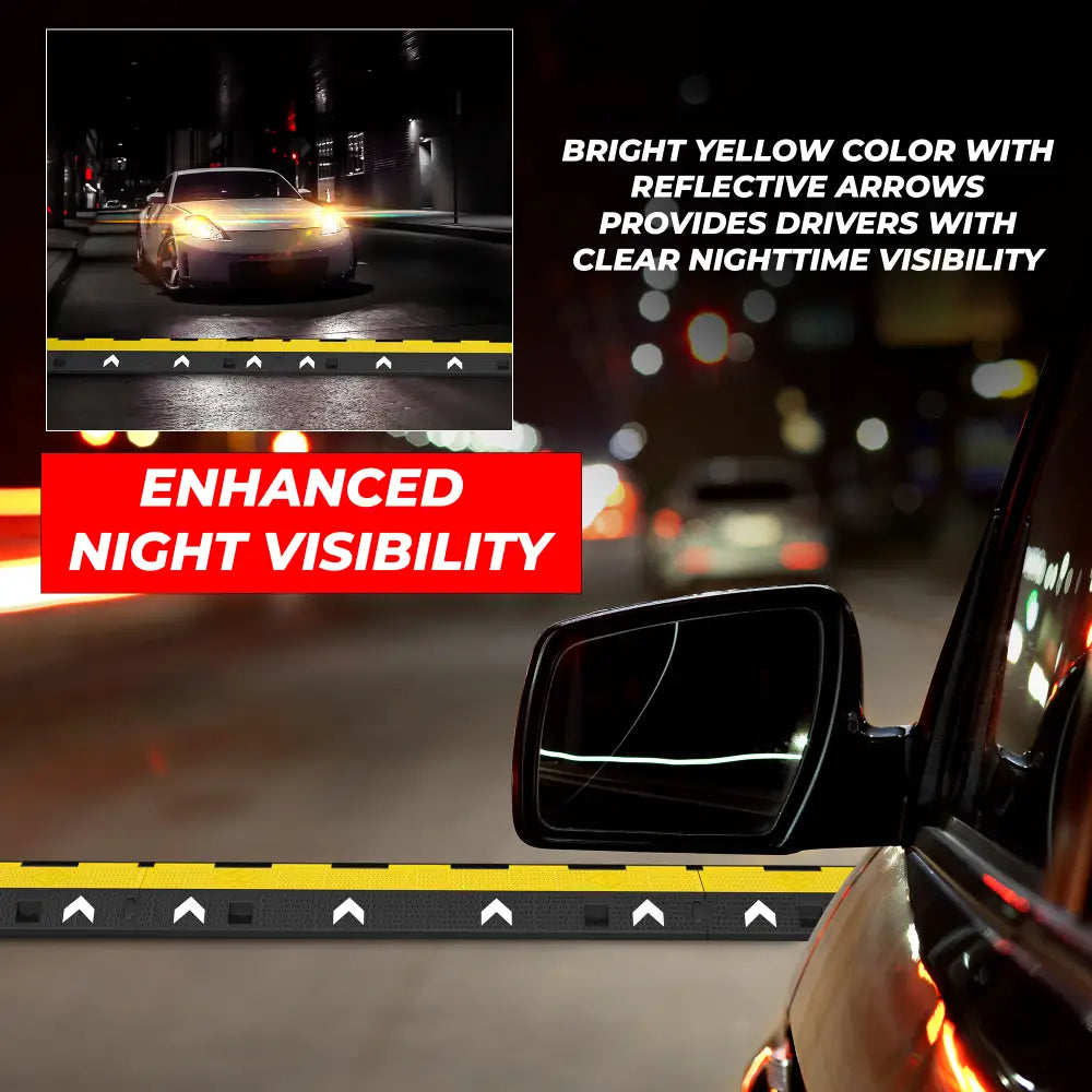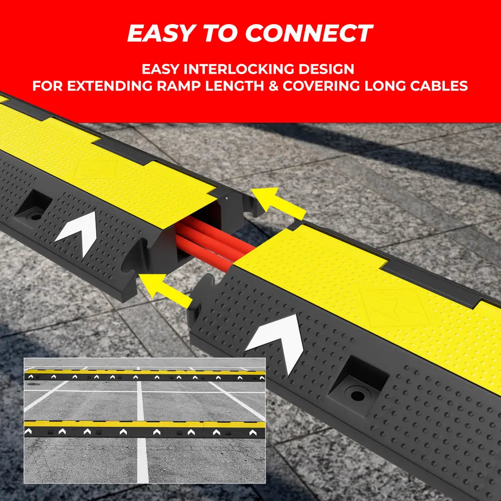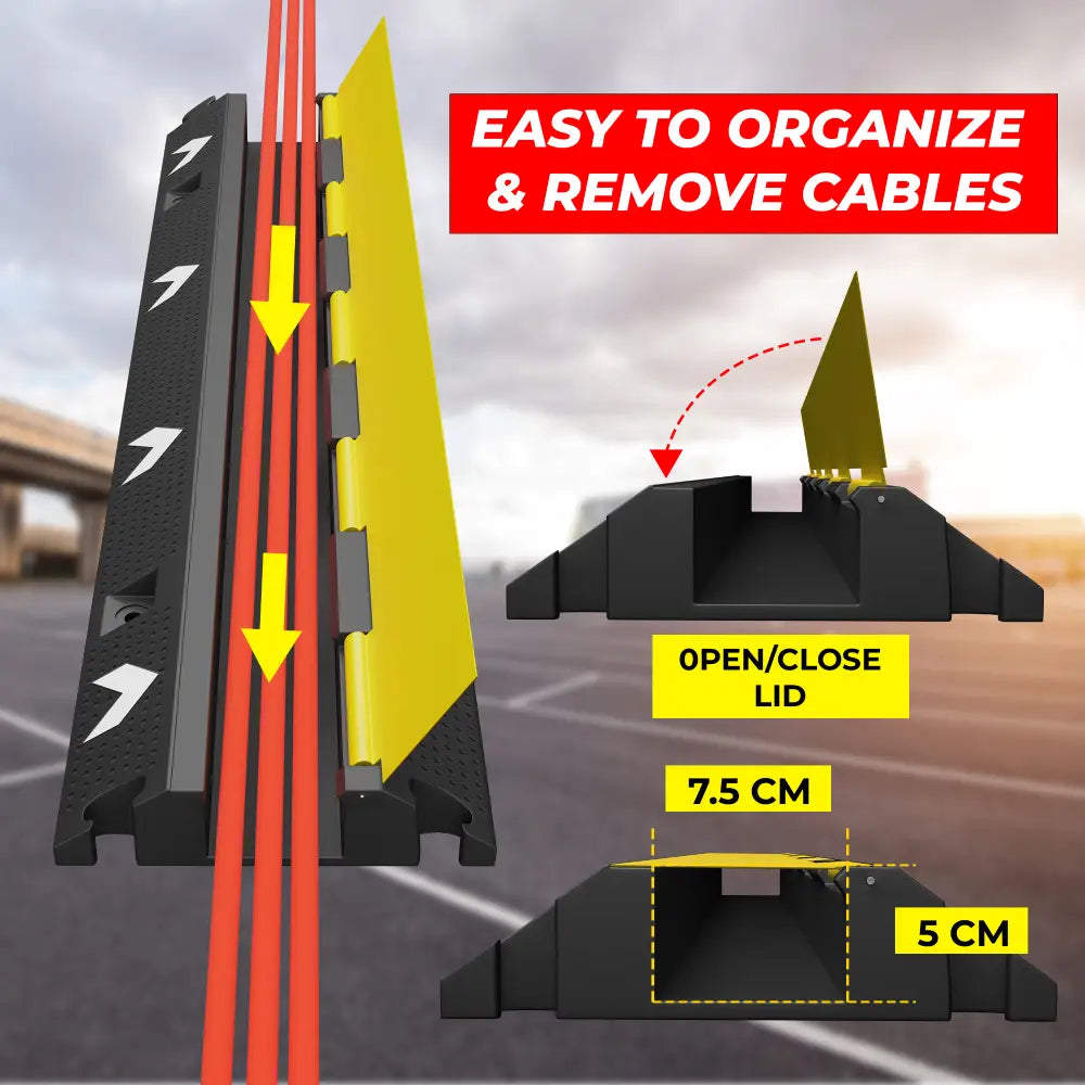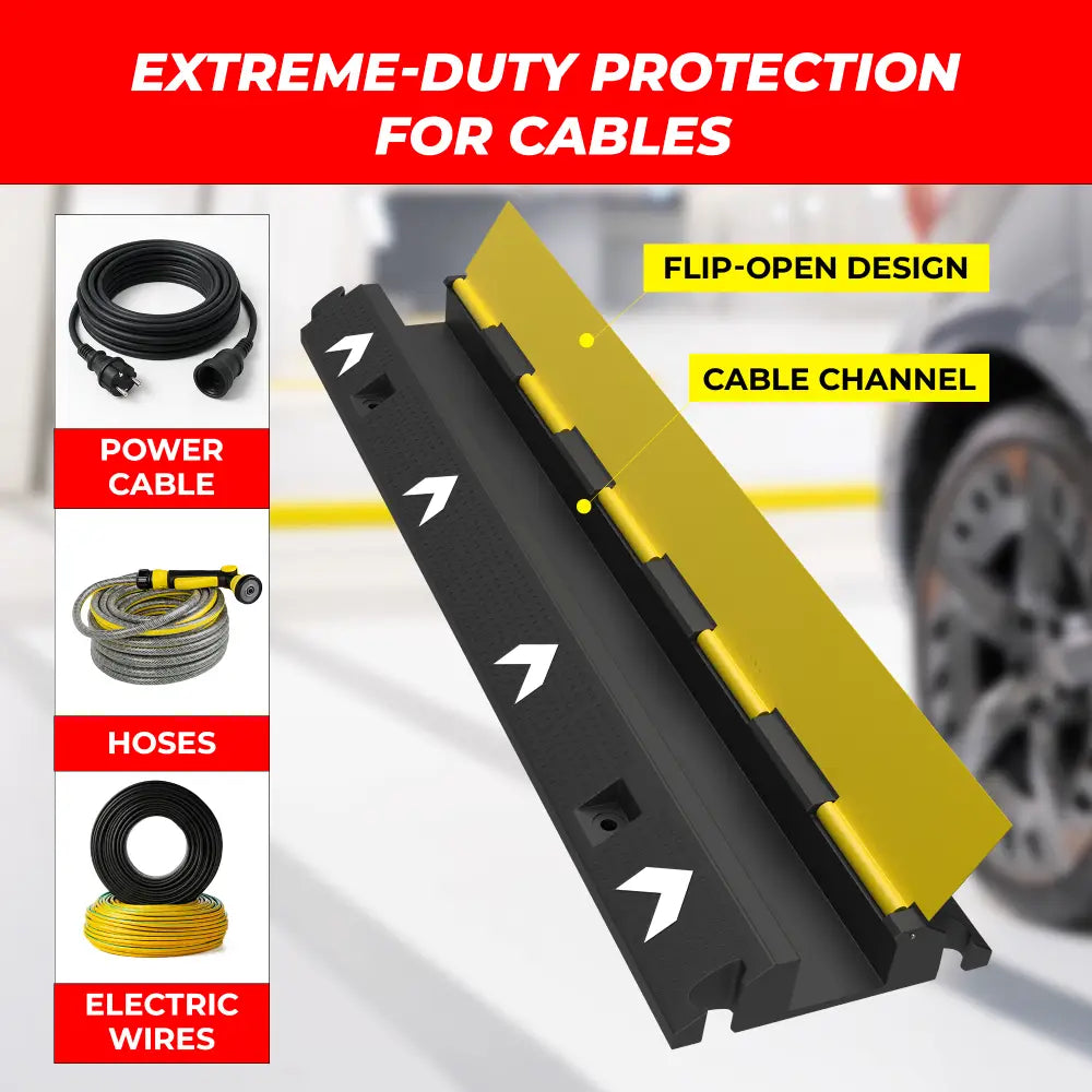 Single Channel PVC Cable Protector with Reflective Flip Lid is designed to protect cables and wires in high-traffic environments while preventing tripping hazards. Made from heavy-duty PVC compound, it provides excellent durability and long service life in indoor and outdoor conditions. The anti-slip textured surface improves safety for pedestrians and vehicles, while the bright yellow flip lid with reflectors ensures high visibility during day and night. Its modular interlocking design allows multiple protectors to connect for extended coverage, making it ideal for events, offices, warehouses, garages, and road safety applications.