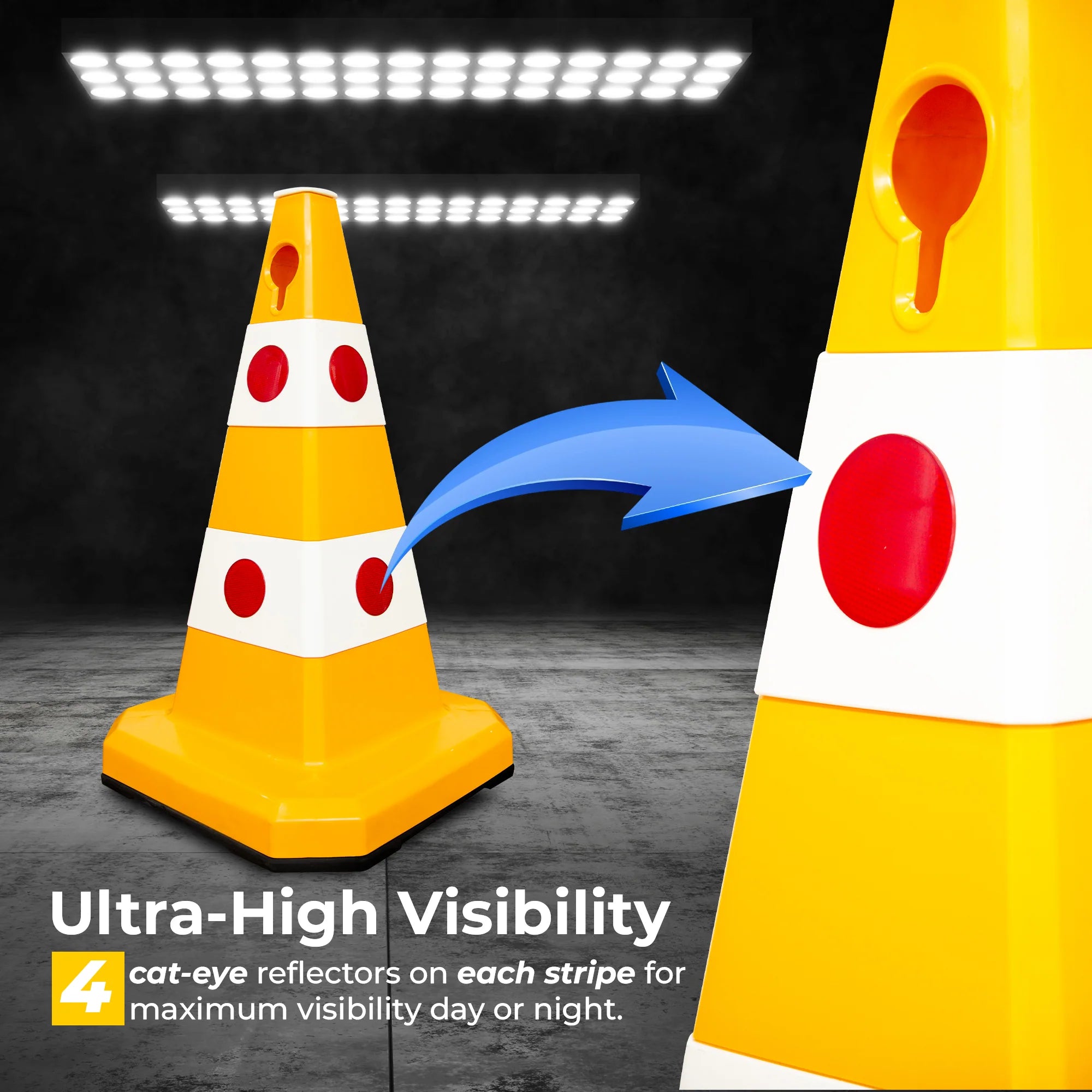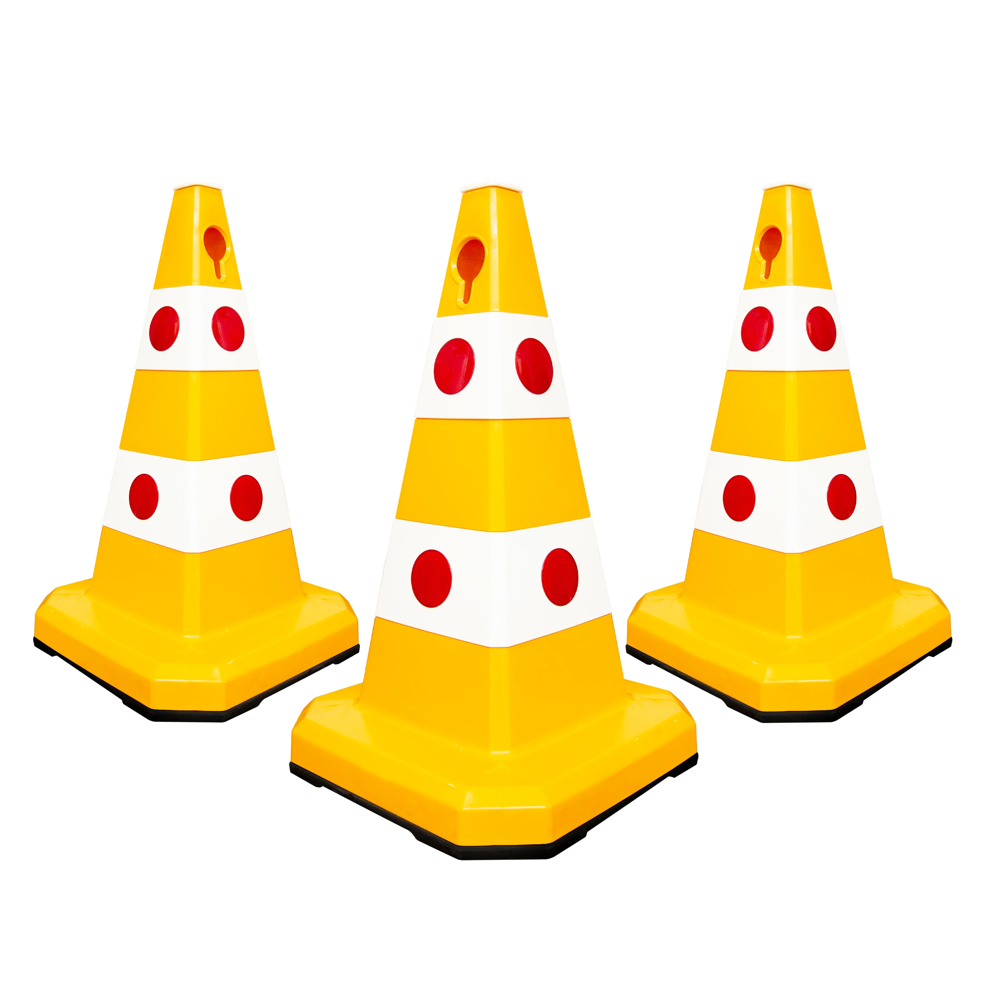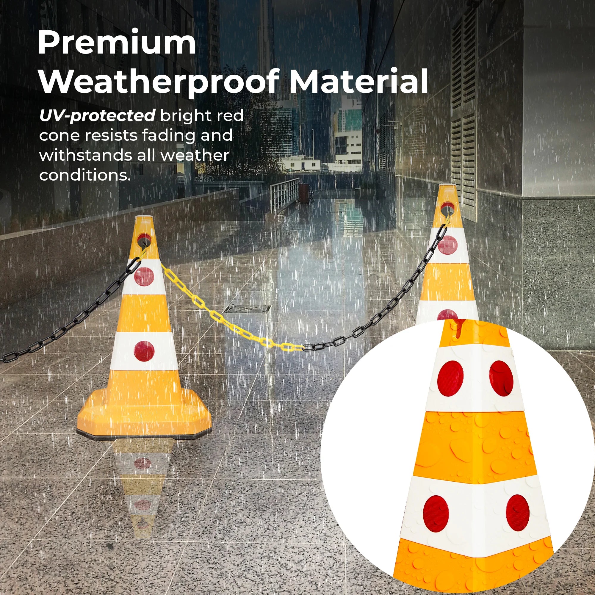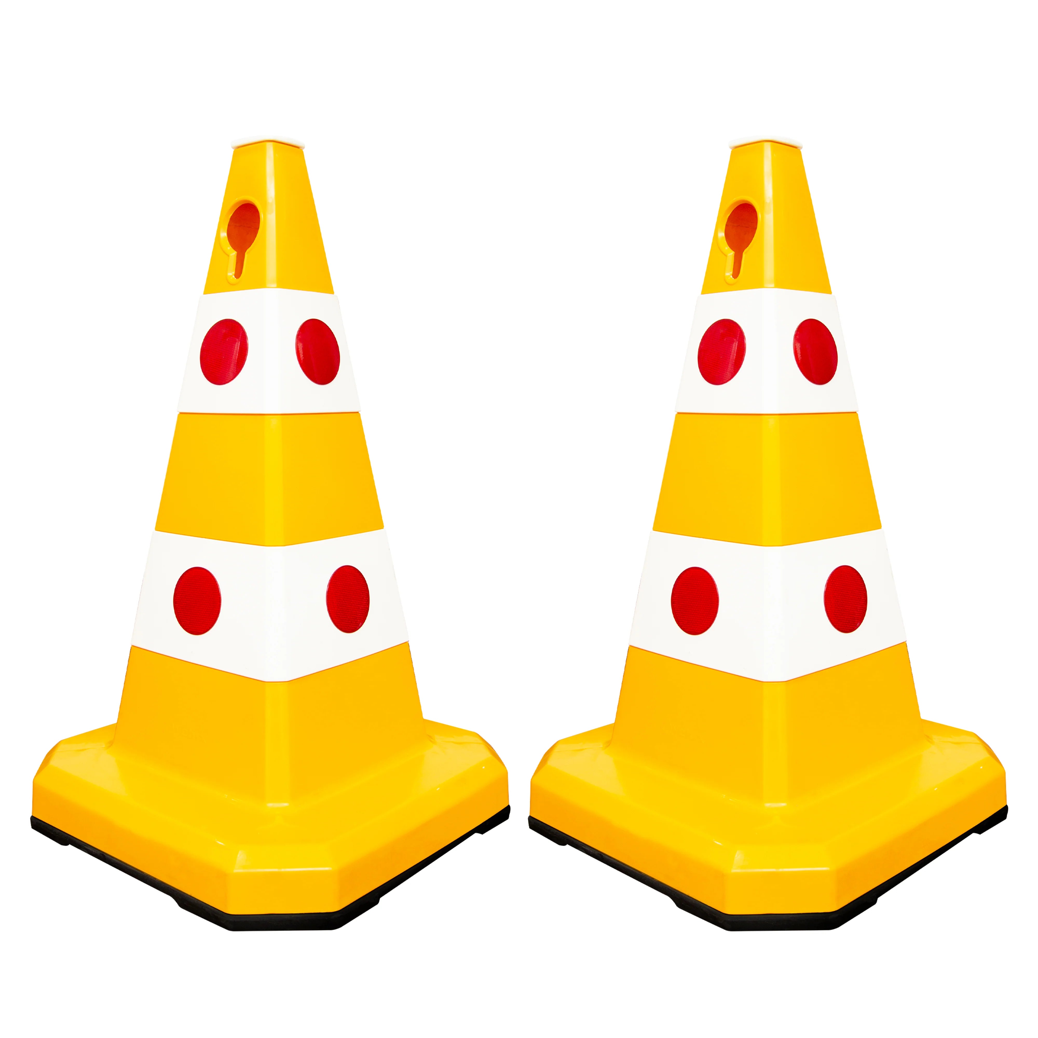 Height: 62CMColor: Yellew & WhiteMaterial: Solid Body PlasticBase Material: Rubber Weighted BaseReflective Elements: Cat-Eye LensesWeather Resistance: YesAttachments: Socket for Signs/Lights & Chain Hole